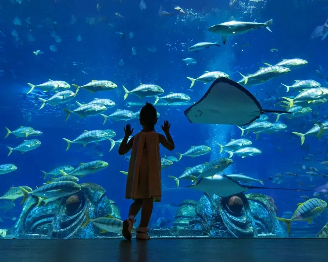 ▲小朋友在三亚·亚特兰蒂斯水族馆大使环礁湖观看鱼群