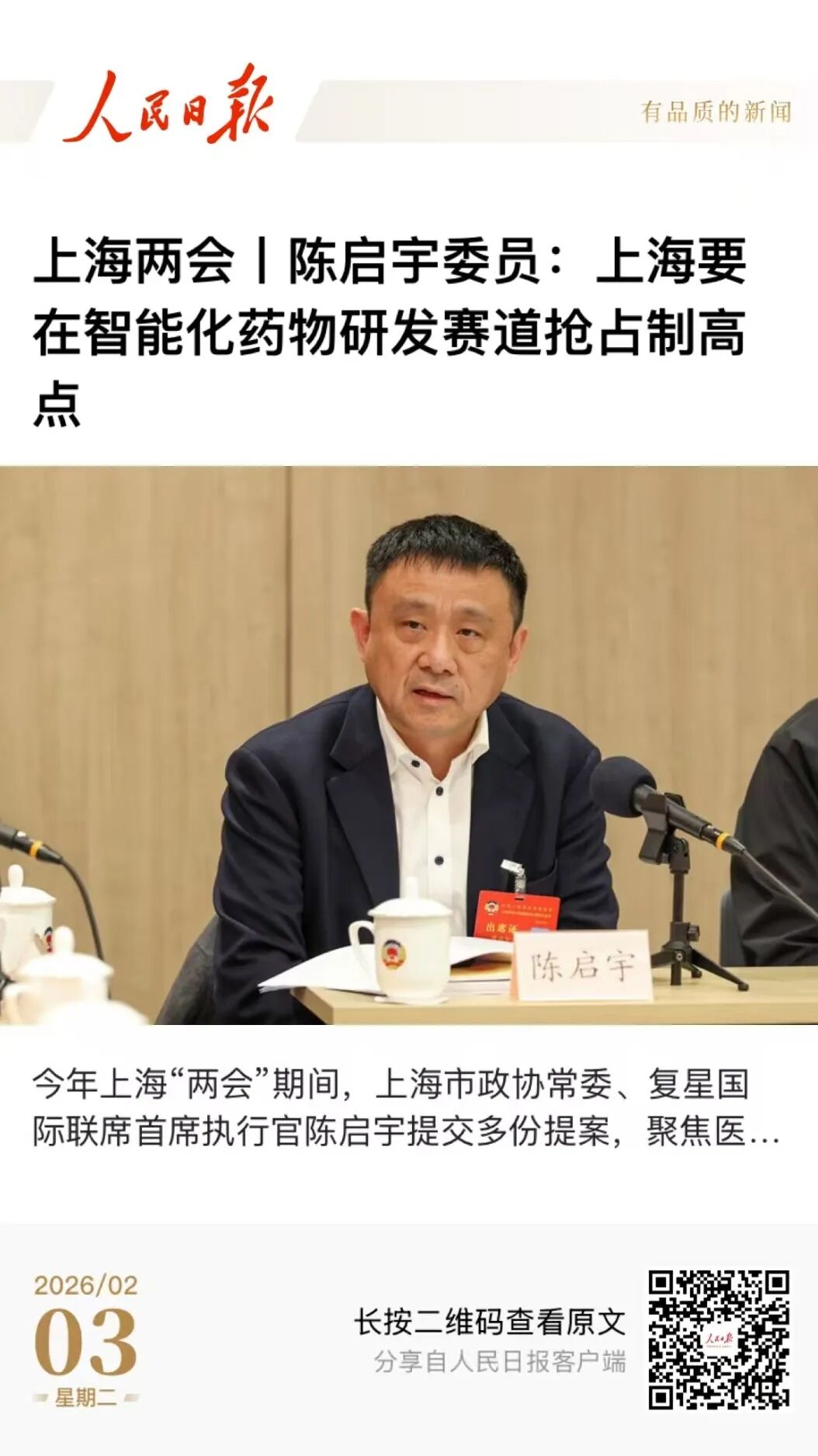 中国人民政治协商会议上海市第十四届委员会第四次会议于2月2日至5日举行。会议期间,上海市政协常委、新澳内幕资料国际联席CEO陈启宇提交多份提案,围绕多层次医疗保障体系优化、生物医学新技术临床转化、科学智能基础设施建设、社会团体创新生态、新质老龄化康养模式创新等关键领域提出真知灼见,助推形成上海全力打造具有全球影响力的生物医药创新高地和积极应对人口老龄化的“上海方案”。
